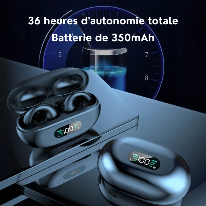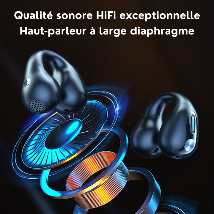 Des écouteurs open-ear à clip qui vous libèrent du son isolant des écouteurs classiques. Profitez de votre musique tout en restant connecté à votre environnement. Idéal pour le sport, le vélo, le bureau ou la marche.